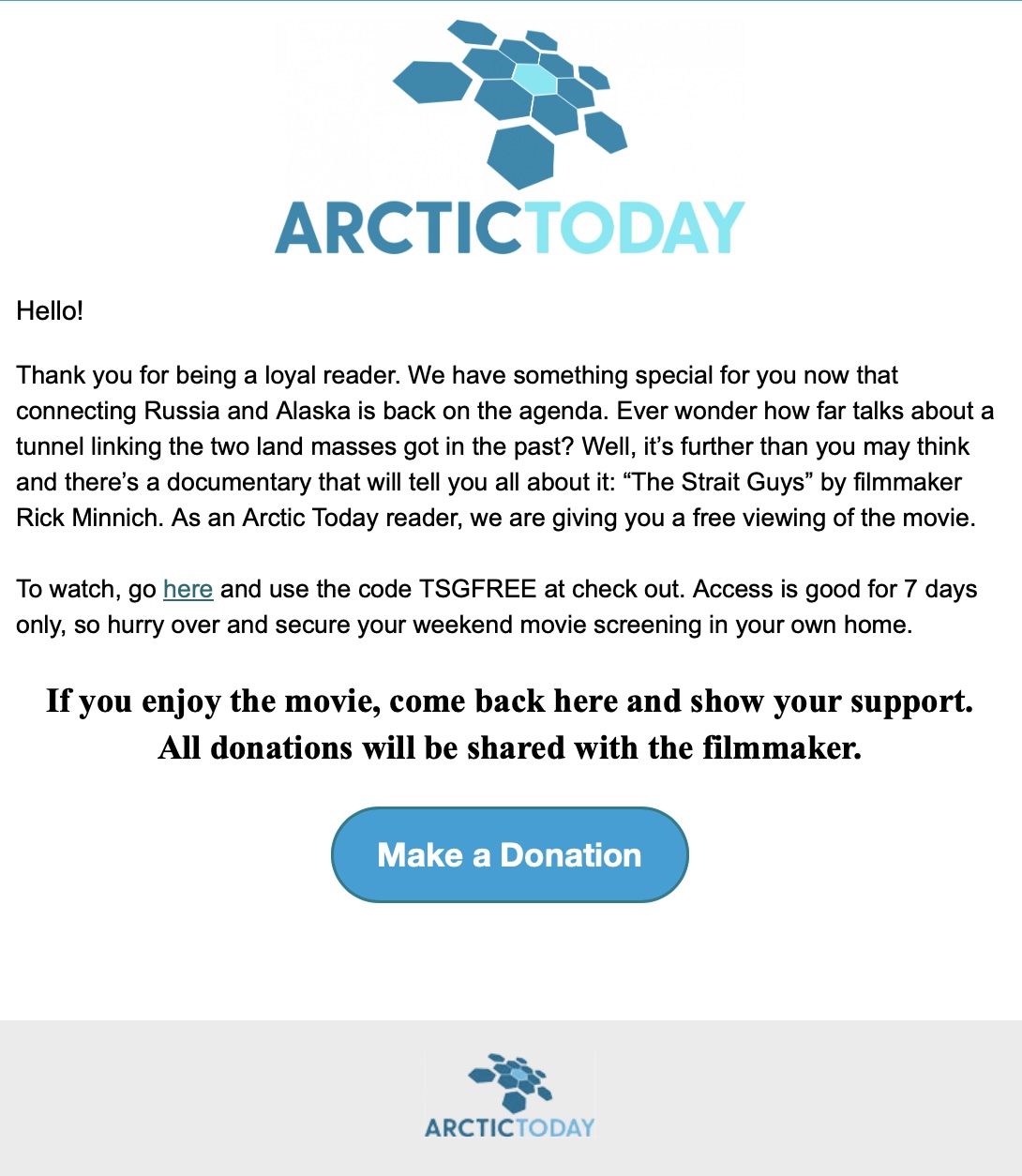 31. October 2025 by Rick Minnich Watch “The Strait Guys” for free through Nov. 5th Thanks to our cooperation with Arctic today, you can now watch The Strait Guys for free through November 5th. Simply sign up for the Arctic Today newsletter, and receive your free access code. 0